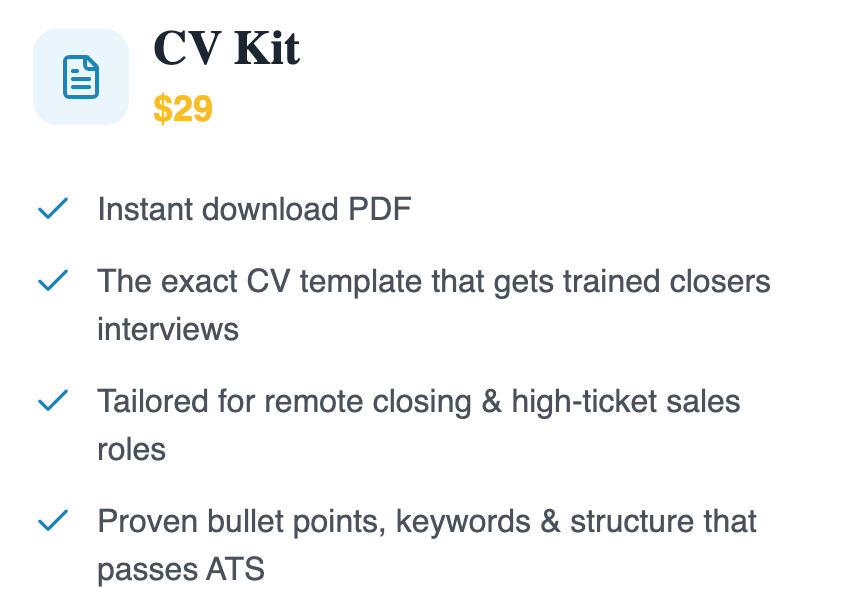 Most advice is generic. These kits are built specifically for remote closing roles, based on what companies are actually looking for and how they hire.